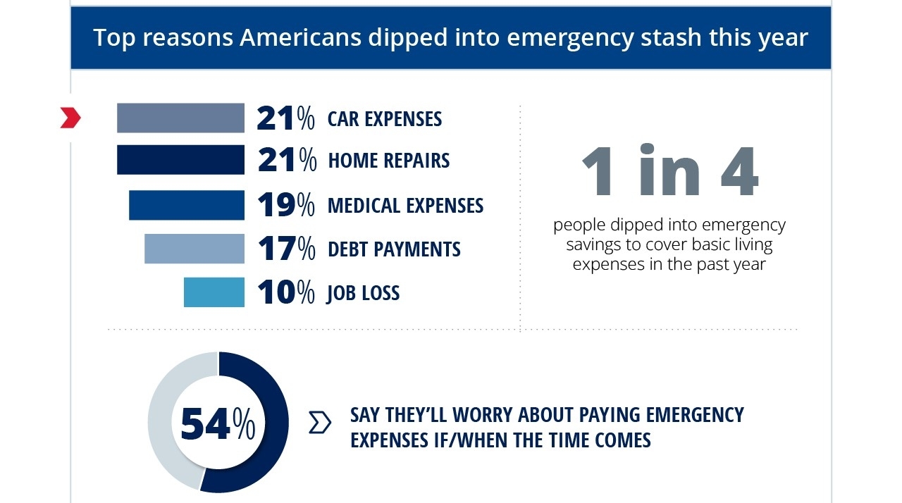 Emergency funds are an important part of your financial plan. This money is designed to cover unexpected events like job loss, major medical bills, car repairs, and home repairs. In the past year, more than one third (35%) of Americans were able to steer clear of unexpected financial situations, but others tapped emergency savings to take care of day-to-day outlays, with 1 in 4 (25%) dipping into emergency savings to afford basic living expenses.