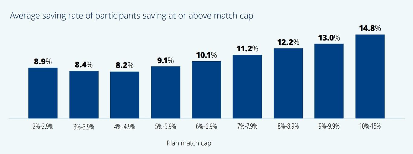 While over half of all plans offer a 5% match cap, those with higher caps of 8% or more showed the most robust saving behavior.2 Participants saving at a 5% to 5.9% match cap saved 9.1% overall, while those at a 6% to 6.9% match cap saved an average of 10.1%, and those at a 10-15% match cap saved an average of 14.8%.