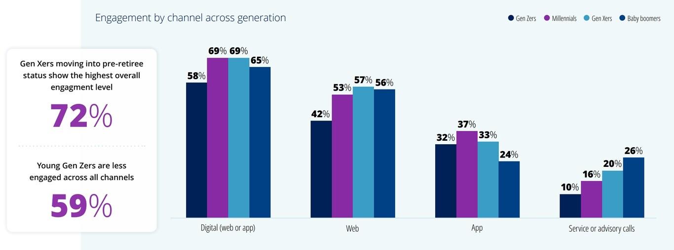 Gen X leads in overall engagement (72%), while digital-native Millennials make the most use of mobile apps. Boomers prefer phone calls, but log in more frequently for digital sessions once online.