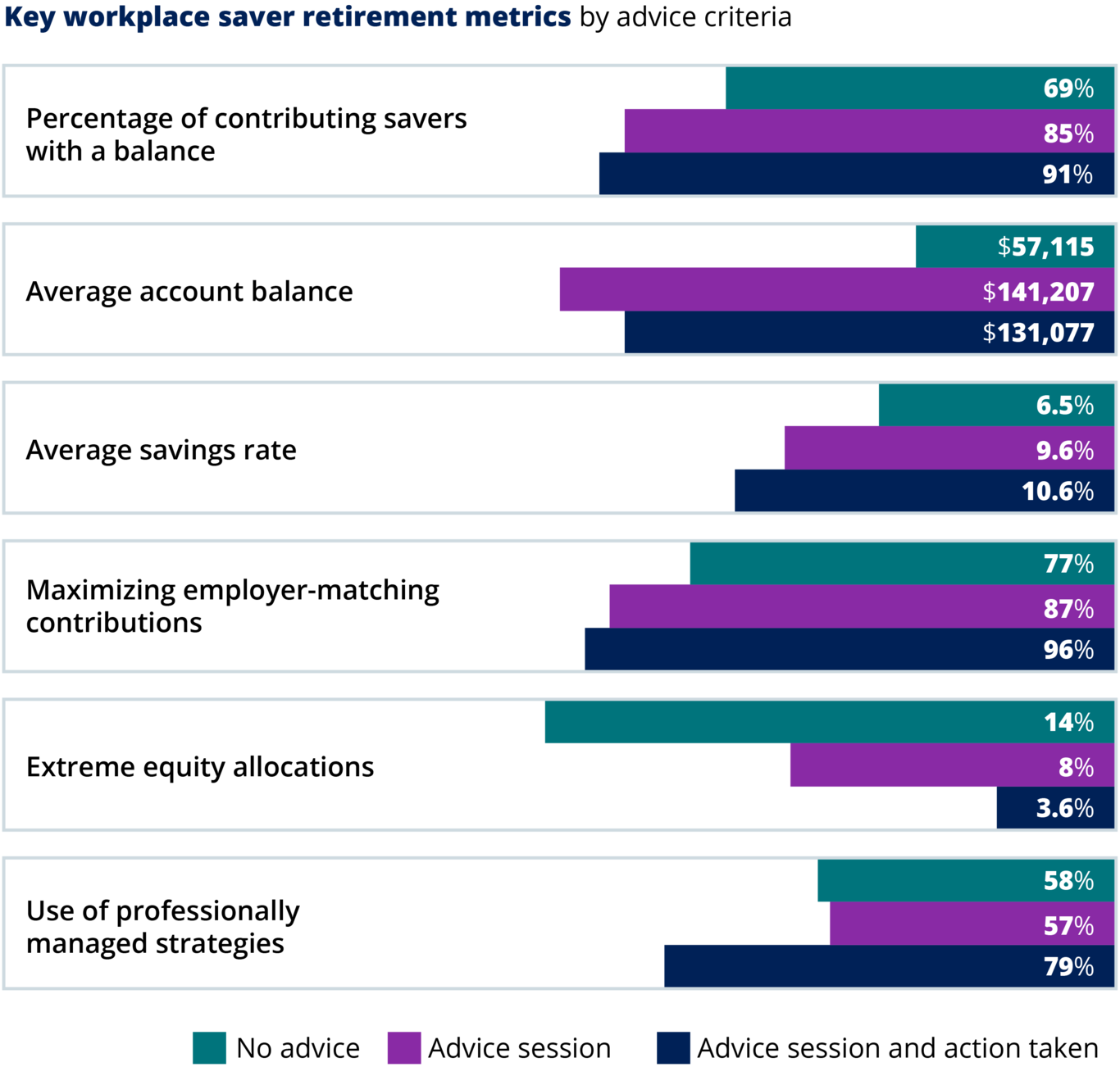 Like the positive correlation between advice sessions and key retirement planning metrics, many positive trends are further reflected by individuals who take action following their advice sessions.