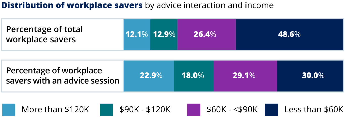 Workplace savings advice is meant to help all participants regardless of income, age, or wealth. The good news is that savers who sought advice in 2023 are from all income levels, but there remains a large opportunity to encourage even more low earners and younger participants to take advantage of available services.