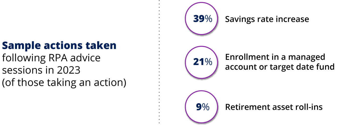 Given the positive actions taken by individuals who receive advice, it’s important to encourage workplace savers to take advantage of available advice sessions. RPAs we spoke with shared tips on what helps drive one-on-one advice sessions and how plan sponsors can help.