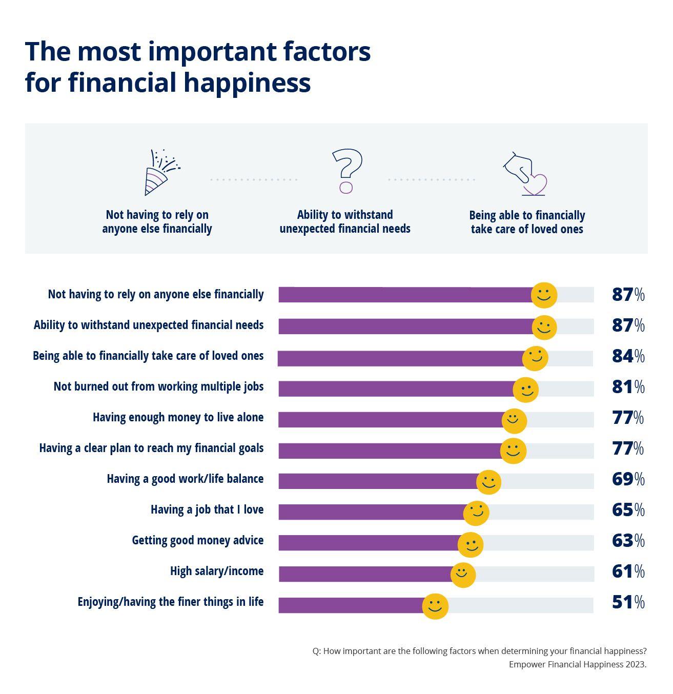 - The secret to experiencing more happiness? Having a plan of action: Seven in 10 (73%) believe that “a solid financial plan would bring me happiness.” In fact, those with a detailed financial plan seem to experience greater overall life happiness, with a significant boost in their financial well-being.