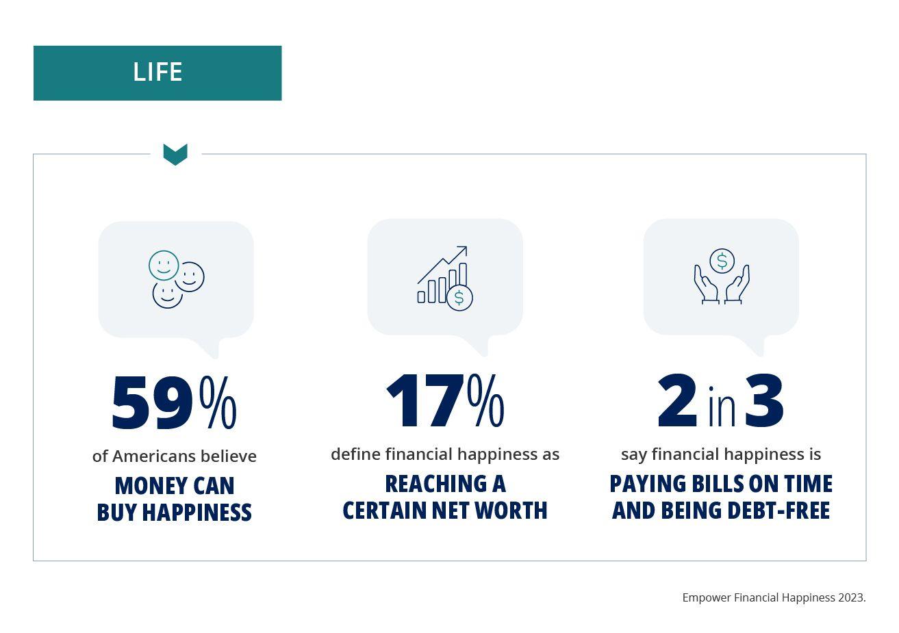 - Most Americans believe that money can buy happiness, but it amounts to more than net worth: 71% of Americans believe that “having more money would solve most of my problems” and 59% of Americans say money can buy happiness – though just 17% say financial happiness is reaching a certain net worth. Most associate happiness with on-time bill payment (67%) and a debt-free status (65%). For 44% of Americans, including 58% of Gen Z and 55% of Millennials and Gen X, financial happiness means having a good work/life balance.