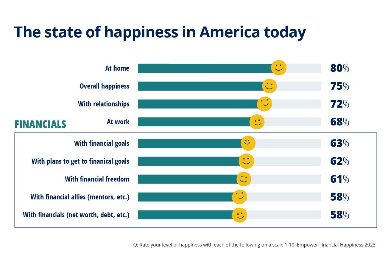 - Financial happiness is about health as much as wealth: Americans agree that a boost in financial happiness would make people healthier (79%) in all aspects of life, including generate more productivity/creativity at work (77%), help build generational wealth (84%), inspire people to pay it forward (78%), and help close the wealth gap (75%).