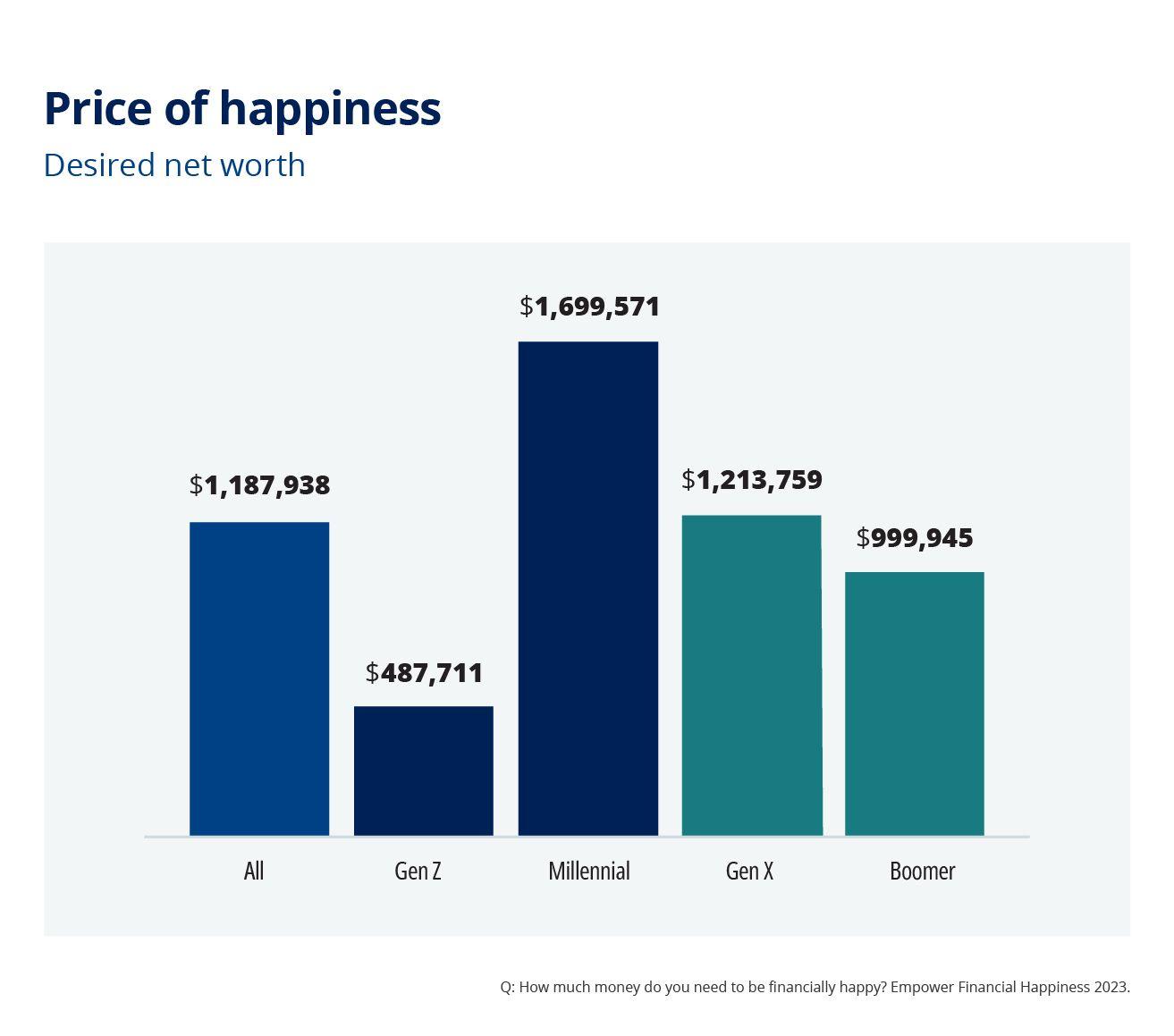 - The price tag for financial happiness is $1.2 million, and Millennials estimate needing more wealth than other generations to be comfortable: When it comes to salary, Americans say they need $284,167 per year to be happy, with men’s estimates much higher than women ($381k and $183k, respectively). Millennials put the number at $525k, Gen Z $128k, Gen X $130k, and Boomers $124k, annually.