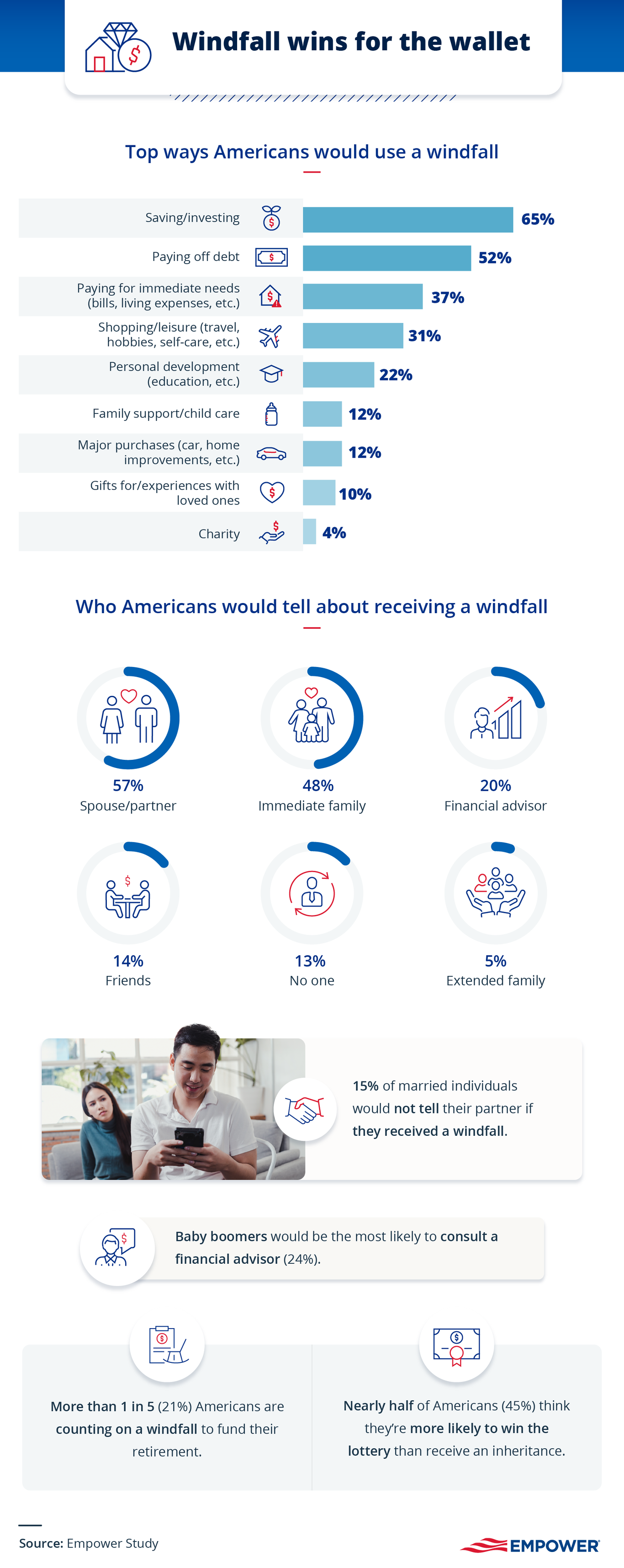 A little windfall can do wonders, according to Americans. Common windfall scenarios include receiving an annual bonus, tax refund, an inheritance, or even a big lottery win. What would you do with unexpected financial gains? Americans are most likely to save or invest the money (65%), pay off debt (52%), or use the funds for immediate financial relief (37%), like paying their bills.