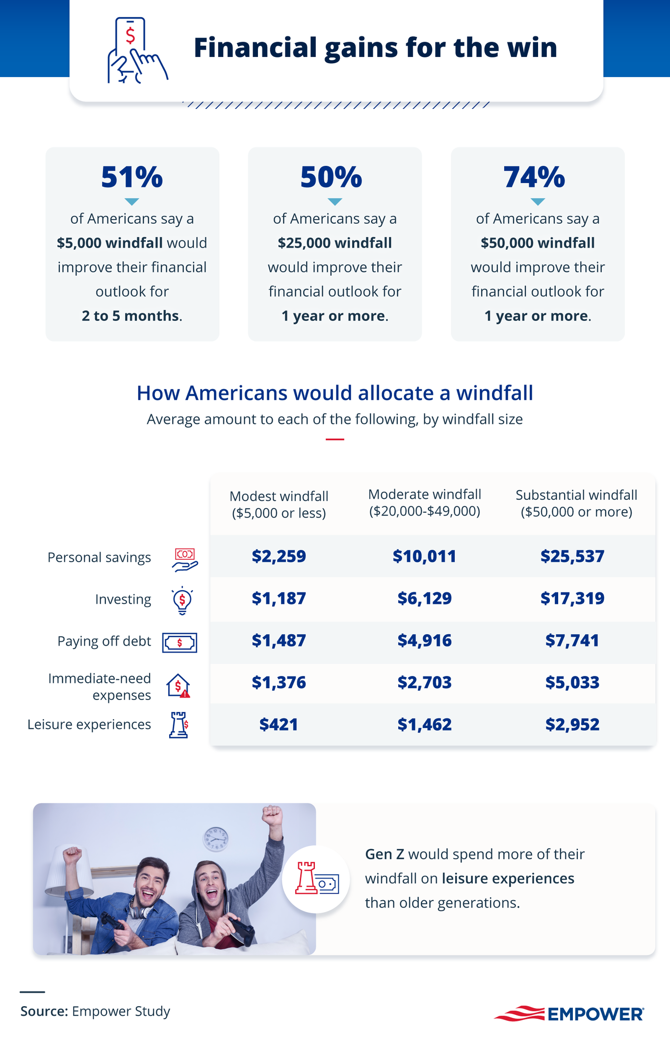 As it turns out, a little can go a long way: for more than half of Americans (51%), a windfall of $5,000 would be enough to improve their financial outlook for two to five months. For a windfall of that size, Americans would save $2,259 of it and put $1,487 toward paying down debt, on average. Nearly the same amount (50%) say a windfall of $25,000 would provide relief for more than a year.