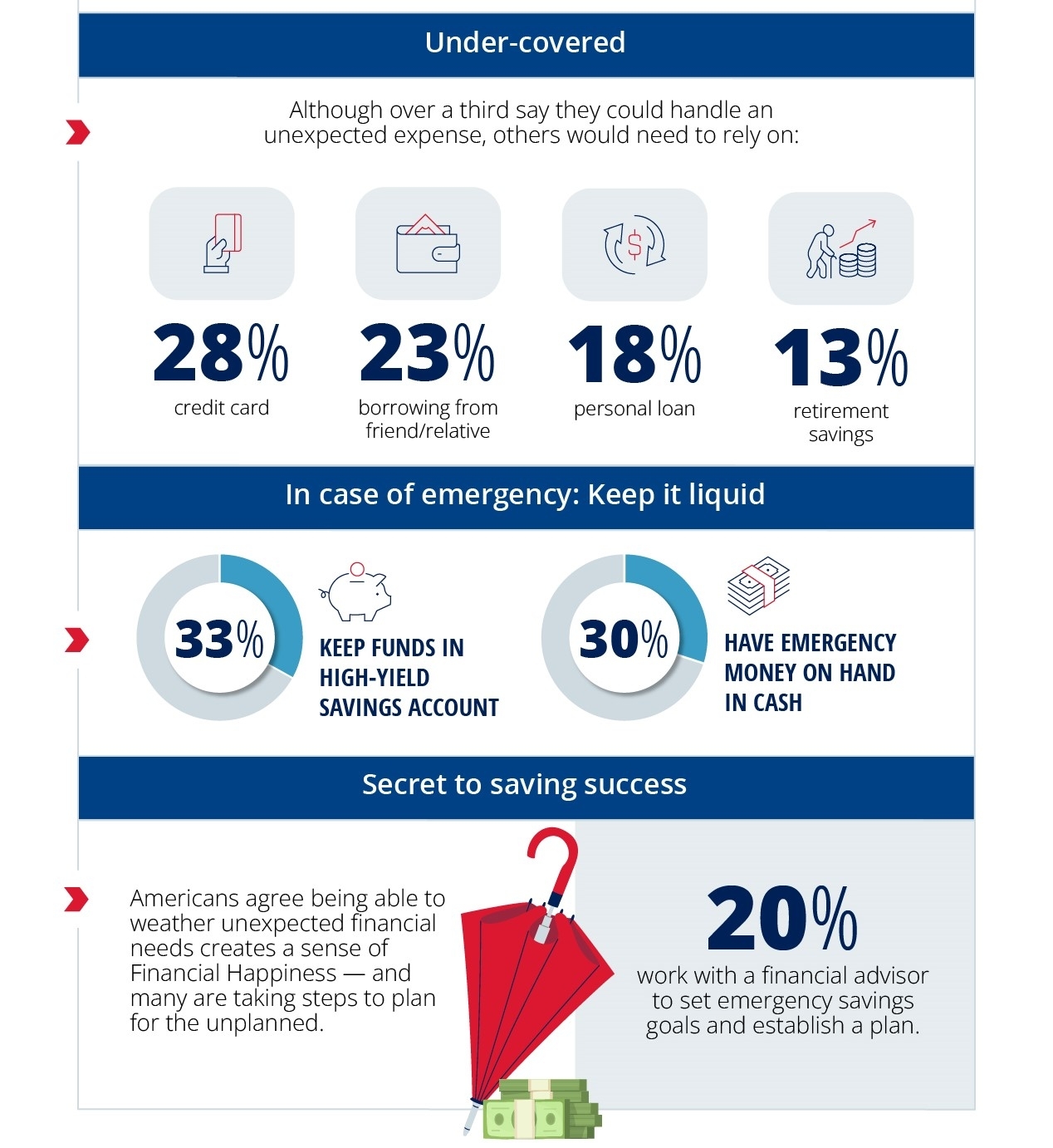 Emergency funds are an important part of your financial plan. This money is designed to cover unexpected events like job loss, major medical bills, car repairs, and home repairs. In the past year, more than one third (35%) of Americans were able to steer clear of unexpected financial situations, but others tapped emergency savings to take care of day-to-day outlays, with 1 in 4 (25%) dipping into emergency savings to afford basic living expenses.