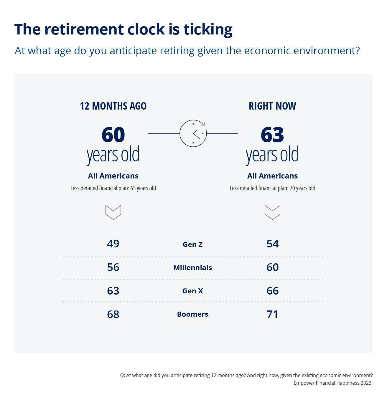 With inflation and the cost of living on the rise over the last 12 months, Americans now anticipate retiring three years later, at age 63. Those who have a less detailed financial plan (or no plan at all) don’t expect to clock out until age 70, five years later than planned.