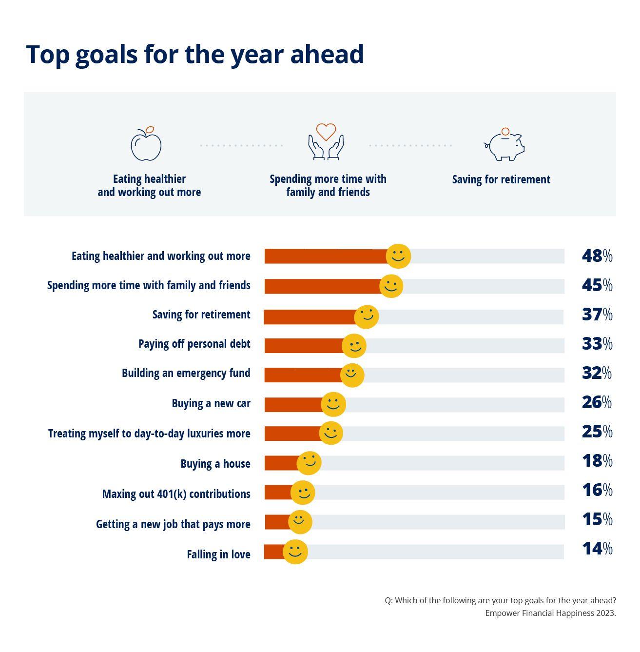 When it comes to setting goals for the year ahead, 87% of people’s top goals are related to money. Saving for retirement (37%), paying off personal debt (33%), and building an emergency fund (32%), along with eating healthier or working out (48%) and spending more time with family and friends (45%) rise to the top of the list. A quarter say they plan to treat themselves to more day-to-day luxuries in the year ahead. Just 18% of Americans — and 35% of Gen Z — are focused on buying a house in the next year.
