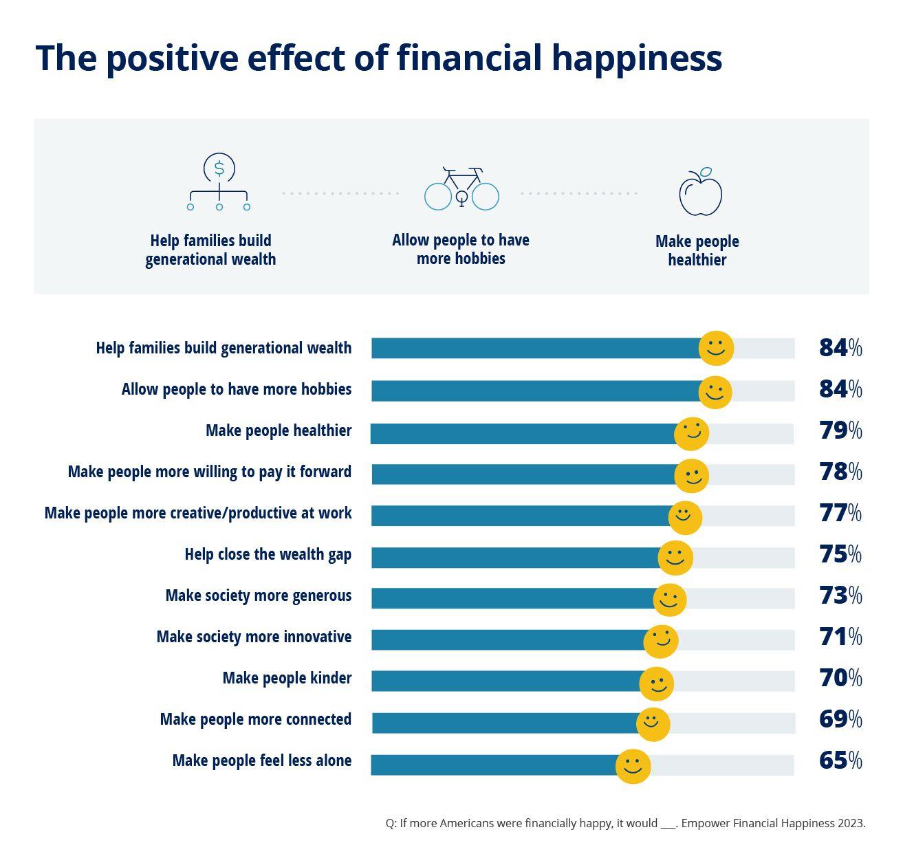 - Financial happiness is about health as much as wealth: Americans agree that a boost in financial happiness would make people healthier (79%) in all aspects of life, including generate more productivity/creativity at work (77%), help build generational wealth (84%), inspire people to pay it forward (78%), and help close the wealth gap (75%).