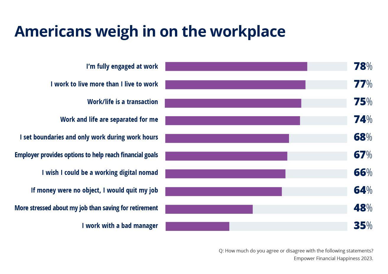 - A balancing act: 74% of Americans say a better work/life balance would bring them more happiness.
